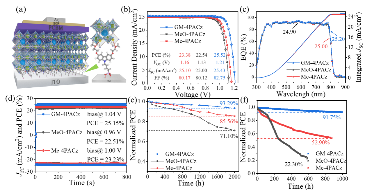 鉴于以上问题,公司刘治科教授团队开发合成了一种新型OSAM,在咔唑基单元引入乙二醇单甲醚(GM)侧链,将合成所得的4-(3,6-乙二醇单甲醚-9H-咔唑-9-基)丁基]膦酸(GM-4PACz)作为空穴传输层。GM基团的引入增强了氧化铟锡(ITO)/SAM衬底的表面能,以促进钙钛矿薄膜的成核和生长,抑制阳离子缺陷,释放SAM/钙钛矿界面处的残余应力,并优化能级排列。最终,基于GM-4PACz的IPSC实现了25.52%的光电转换效率,1.21 V的高开路电压(VOC)和优异的稳定性,器件在空气中老化2000小时后保持初始效率的93.29%,在最大功率点跟踪1000小时后保持初始效率的91.75%。