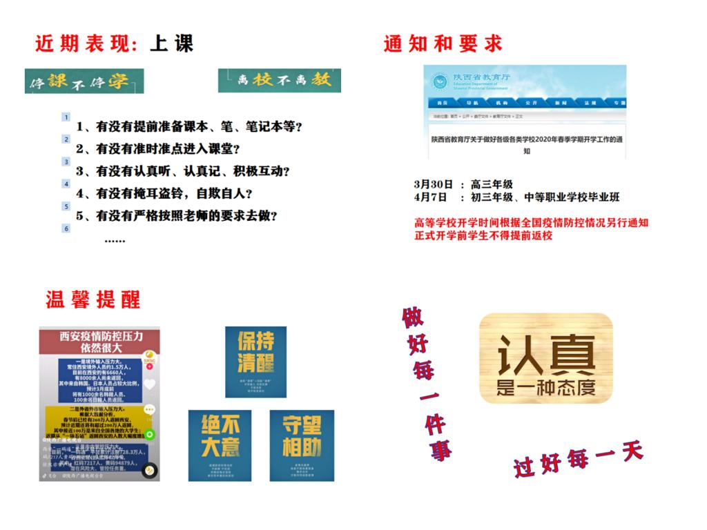接着,赵伟老师就近期同学们在健康打卡、每日签到等方面的具体表现做了总结,尤其对同学们在家的上课情况提出了五个“有没有”,即:上课前有没有准备课本、笔、笔记本等学习用具?有没有准时准点进入课堂?课堂上有没有认真听,认真记,积极互动?有没有掩耳盗铃,自欺欺人?有没有按老师的要求去做?引导同学们认真反思,学会自律。