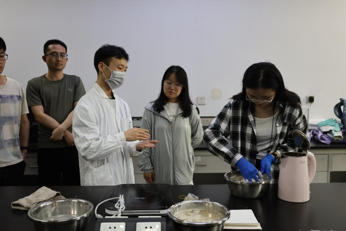 科普志愿者侯紫涣同学详细讲解了传统浆糊的历史与制作工艺,展示了制作浆糊的具体步骤,并邀请现场的同学一起动手制作。传统浆糊是由小麦面粉和清水经过特殊的工艺处理而成,具有强大的粘性和持久的保存效果。装裱字画小托件制作环节,志愿者详细讲解了装裱的每一个步骤,从裁纸、涂浆,到裱贴、晾干,每一步都需细致入微,精益求精。参与者们亲自动手实践,体验了装裱的乐趣和艺术性。