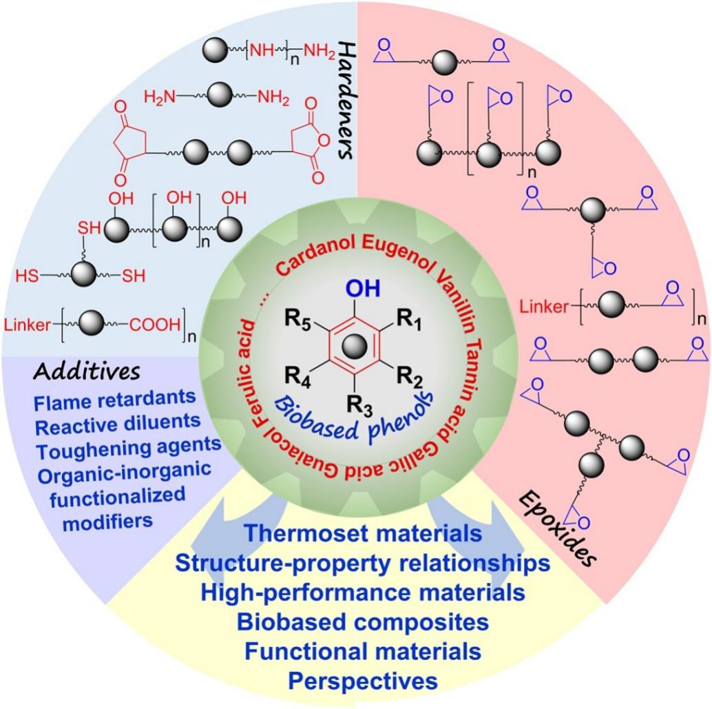 为此,近年来基于可再生生物基单体酚类化合物的环氧树脂引起广泛关注,并在某些具体场合显示出替代双酚A环氧树脂的潜力。近日,公司英国365集团公司官网历史文化遗产教育部工程研究中心胡道道教授、万金涛副教授团队系统综述了近年来基于生物基单体酚的热固性环氧树脂研究进展,以衍生环氧树脂分子结构和化学转化路线为主线,全面梳理和回顾有关的环氧树脂单体、预聚物、固化剂、添加剂和复合材料的研究,并对所得热固性环氧树脂材料的结构和性能进行了综合评论,最后展望了未来研究中的挑战和机遇。相关成果以“Epoxy thermosets and materials derived from bio-based monomeric phenols: Transformations and performances”为题发表在高分子领域国际顶尖期刊《Progress in Polymer Science》(CiteScore=41.1,Impact Factor=22.62),该论文公司为第一单位,参与单位有华南理工大学、化学工程联合国家重点实验室(浙江大学)、江苏科技大学和西班牙马德里高等材料研究所,第一作者和通讯作者为公司英国365集团公司官网万金涛副教授,马德里高等材料研究所王德义高级研究员为共同通讯作者。