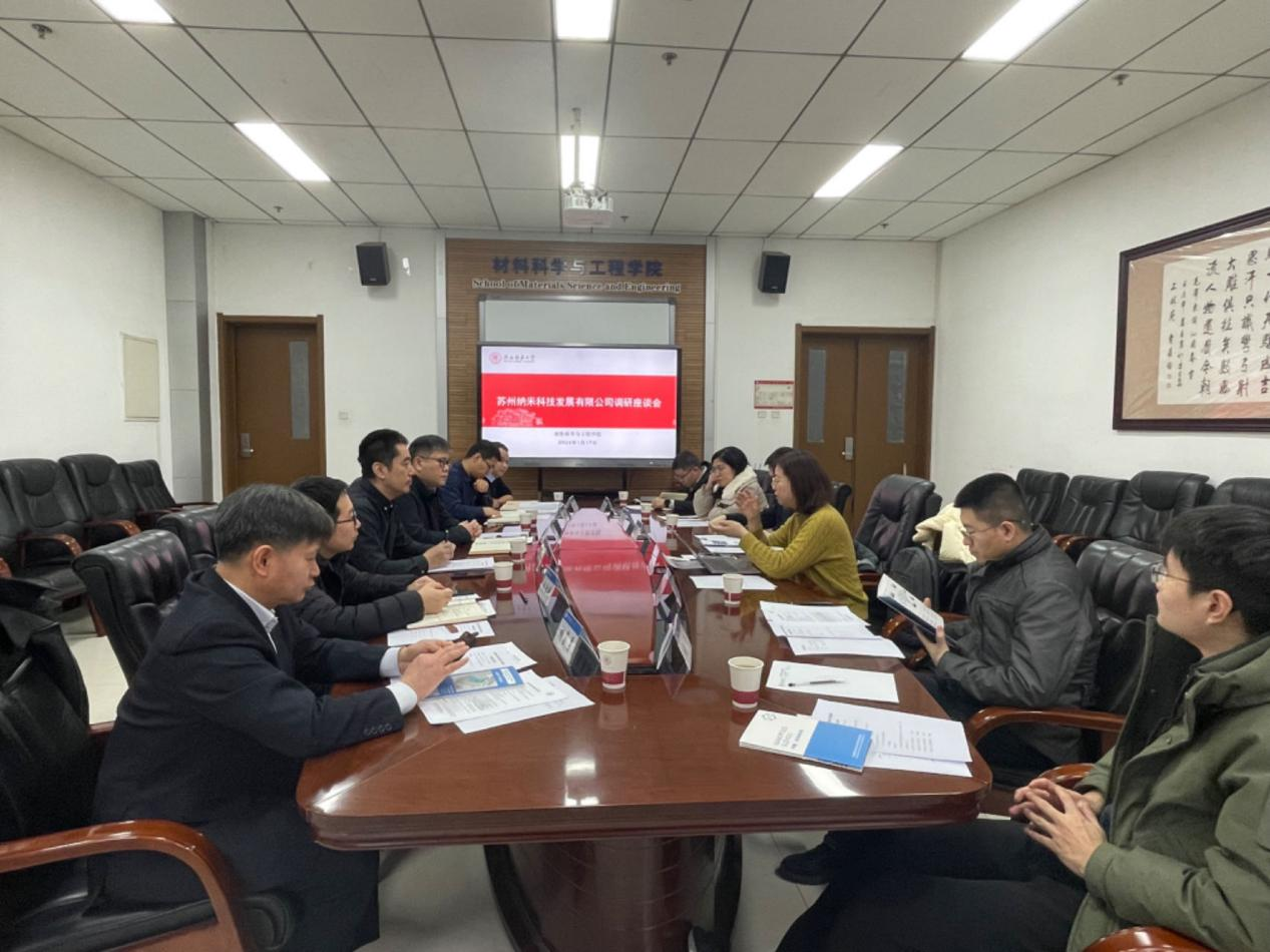 为促进产学研合作,拓宽成果转化渠道,苏州纳米科技发展有限公司于1月17日赴公司开展调研座谈会。公司党委书记郑鹏、经理曾京辉、副经理刘治科、江瑞斌和学术骨干教师参加座谈会。